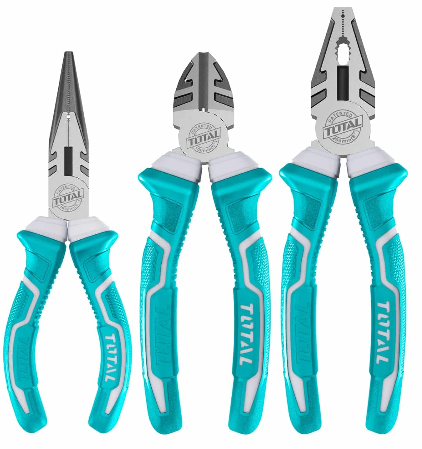Set de 3 alicates TOTAL: alicate combinado de 7″, alicate de punta larga de 6″ y alicate de corte diagonal de 6″. Fabricados en acero endurecido con mangos ergonómicos para trabajos de corte, agarre y precisión.