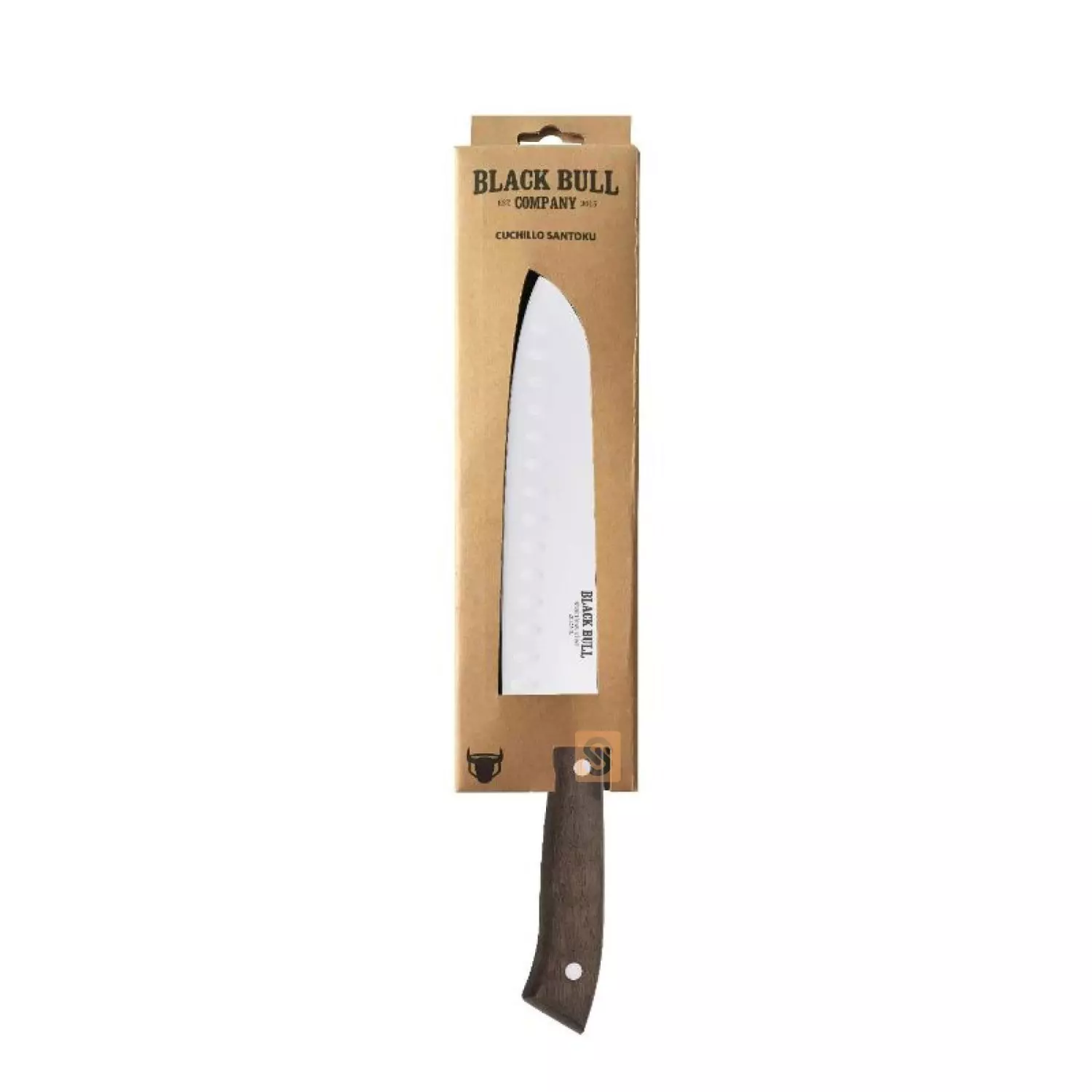 Cuchillo Santoku 7” Black Bull con mango de madera de acacia. Fabricado en acero inoxidable con revestimiento antiadherente, extra filo y tratamiento antioxidante. Diseño profesional de una sola pieza, equilibrado, resistente y perfecto para cortes de carne, vegetales y todo tipo de preparaciones.